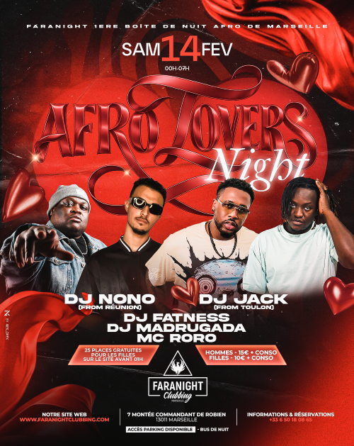 Afro Lovers Night se déroule à Marseille le 14 février à la Faranight Clubbing pour une soirée spéciale Saint-Valentin mêlant amour et vibes afro avec DJ Nono, DJ Jack, DJ Fatness, DJ Madrugada et MC Roro, dans la première boîte de nuit afro de Marseille, ambiance clubbing sensuelle portée par les sons afro, love, urban et caribéens, 25 places gratuites réservées aux femmes avant 01h avec le code promo FARAFREE25, entrée hommes 15€ avec consommation et femmes 10€ avec consommation, un événement romantique et festif à la Faranight Clubbing pour célébrer l’amour au rythme de la nightlife afro marseillaise.