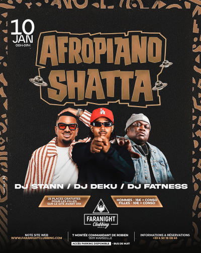 Afropiano Shatta débarque à Marseille le 10 janvier à la Faranight Clubbing pour une soirée afro urbaine explosive avec DJ Stann, DJ Deku et DJ Fatness, dans l’une des boîtes de nuit afro incontournables de Marseille, ambiance clubbing rythmée entre afropiano, shatta et sons afro modernes, 25 places gratuites réservées aux filles avant 01h, entrée hommes 15€ avec consommation et filles 10€ avec consommation, une nuit festive et intense à la Faranight Clubbing dédiée aux amateurs de vibes afro actuelles.