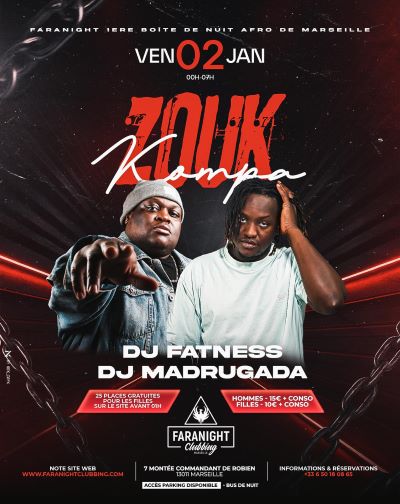 Zouk Kampa arrive à Marseille le 2 janvier à la Faranight Clubbing pour une soirée afro caribéenne incontournable avec DJ Fatness et DJ Madrugada, dans l’une des meilleures boîtes de nuit afro de Marseille, ambiance clubbing, sons zouk, kampa, afro et vibes tropicales, 25 places gratuites réservées aux filles avant 00h, entrée hommes 15€ avec consommation et filles 10€ avec consommation, rendez-vous à la Faranight Clubbing pour une nuit festive, sensuelle et énergique au cœur de la nightlife marseillaise.